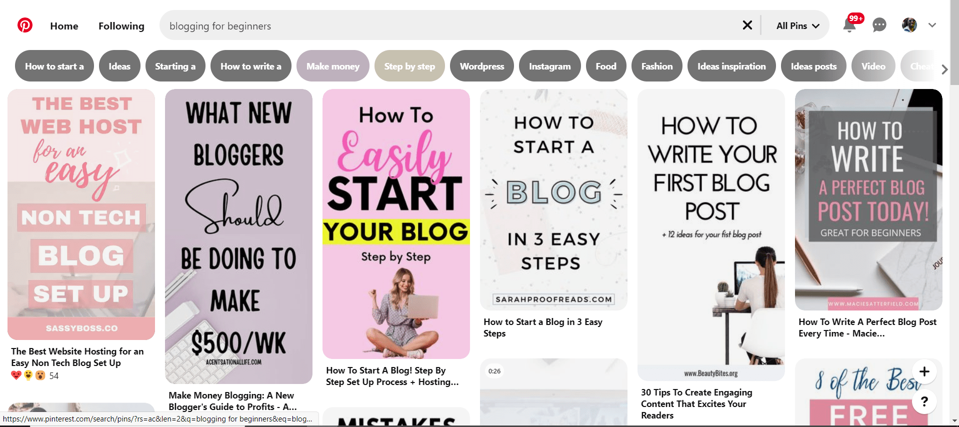 For example, if I search for, “blogging for beginners”, you’ll notice different pins will populate at the top of your search.